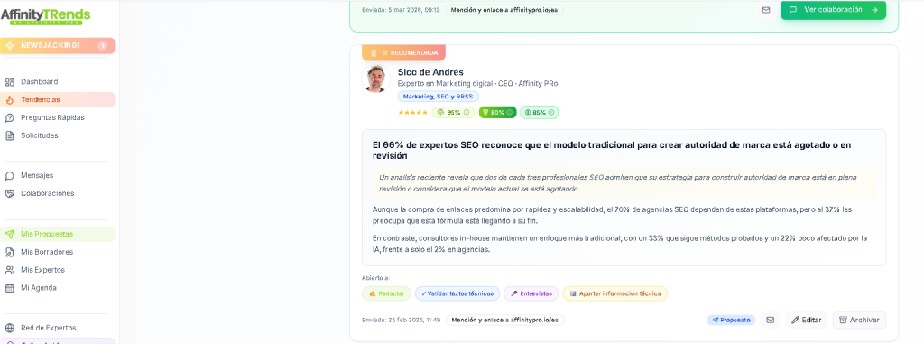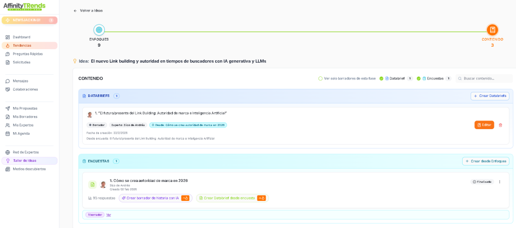 Diseña el mapa de tu estrategia tanto interna como de PR y link building, refuerza tu EEAT vinculando expertos. Apóyate de la IA para obtener nuevas ideas en base a las temáticas de los medios que ya hablan de tí. Tu estrategia a vista de pájaro