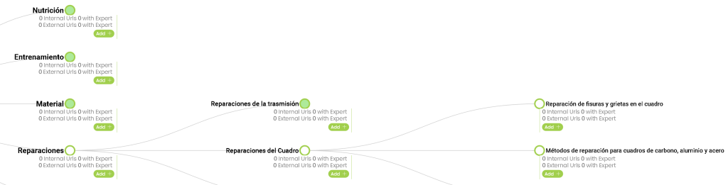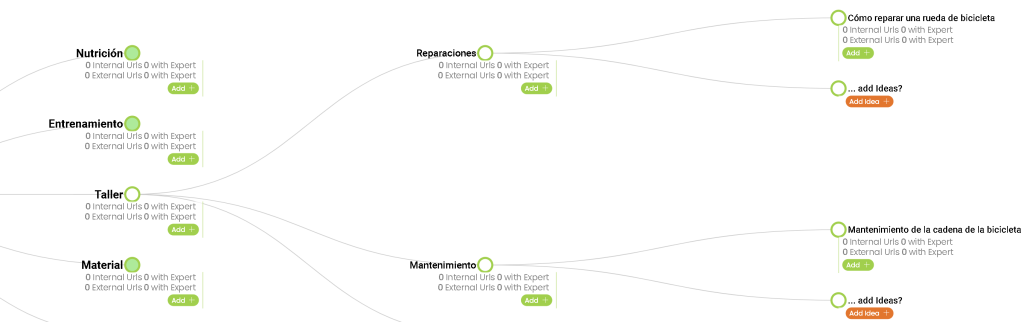 En este ejemplo puedes ver como el proyecto está centrado en material relacionado con el Ciclismo (bicicletas, componentes, ruedas etc. ) pero también existe la categoría de nutrición y entreno y una categoría de taller a la que se me ocurre que podemos sacarle mucho partido en esta estrategia de ejemplo. También te recomiendo analizar su blog en el caso de que lo tenga para extraer temáticas principales. Así a primera vista, este sería el primer nivel de mi «Topical Map» para este proyecto. No le he dedicado ni 5 minutos. Seguramente, si le dedicase más tiempo, encontraría nuevos temás principales pero para el ejemplo, vale.