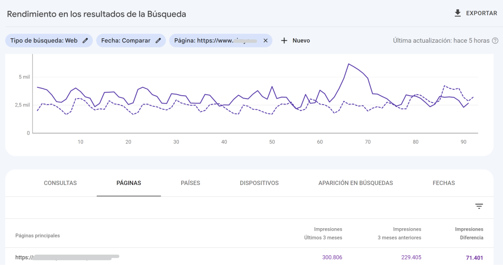 Para medir este indicador usaremos Search console de Google, Bing webmaters tools, Yandex Webmaster Tools o la herramienta que nos facilite el buscador que queramos analizar. En la opción de rendimiento podemos filtrar y medir el rendimiento por URL.