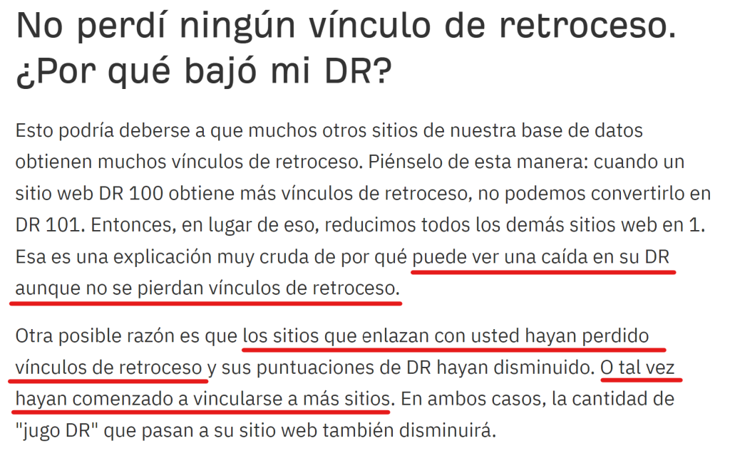 Para muchos/as, los indicadores de autoridad, como el Domain Rating de Ahrefs (DR) o el Authority Score de Semrush, son fundamentales para evaluar el rendimiento de una campaña de link building. En la propia documentación de Ahrefs se muestra como el DR puede variar independientemente de las acciones que tu lleves a cabo ya que depende también de las acciones de terceros.